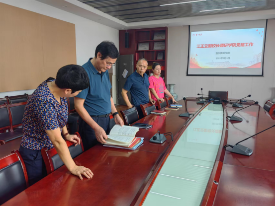 江正云副校长查看了学院主题教育、各支部“三会一课”等活动的开展情况,学院党政联席会议召开与会议记录的情况。随后听取了学院党委书记邹华秀、副书记谭小红、副院长郭宇、副院长刘炜分别关于党建工作、学工工作、教学工作与科研工作在假期的安排与推进情况。最后,江正云副校长就学院各项工作开展作出重要指示。他指出,第一,安全工作是第一要务,学院务必多措施并举,确保暑假在校学生的安全;第二,学院要进一步规范党政联席会议的执行,注意会议的记录、纪要的审核与发布;第三,假期教学工作要统筹重点与日常齐头并进,力争国家一流课程建设取得新进展,新学期新教师课程安排井然有序;第四,产教融合工作要注意落地见效。