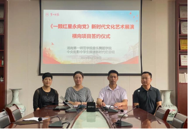 6月28日下午,音乐舞蹈学院与中央新影中学生频道新时代栏目组合作签约仪式在学院会议室举行。中央新影中学生频道新时代栏目组湖南地区负责人胡熙云、音乐舞蹈学院党委书记邹华秀、副院长郭宇、副院长刘炜参加了本次签约仪式。
