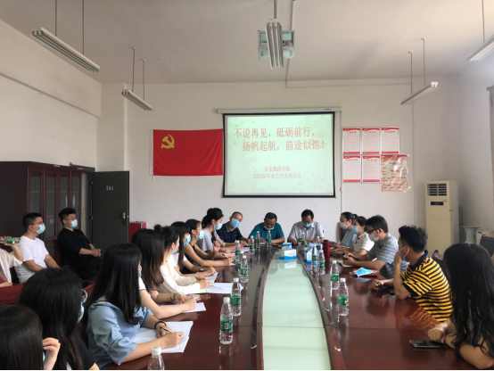 2020年6月12日下午,我院2020届毕业生代表座谈会在学院会议室隆重举行,学院党总支书记谭顺来、院长张应华、副院长杨丹、副书记谭小红、全体辅导员和2020届毕业生代表30余人参加了本次座谈会。