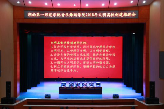 为推进落实我院文明高校创建工作,增强学生主人翁意识,2018年12月9日晚七点,我院在学校田汉剧院组织全体在校学生召开了2018年文明高校创建推进会。学院总支书记谭顺来、副书记杨丹、副院长廖小芒、副院长张应华以及全体辅导员参加大会,学工办主任邓志刚主持大会。