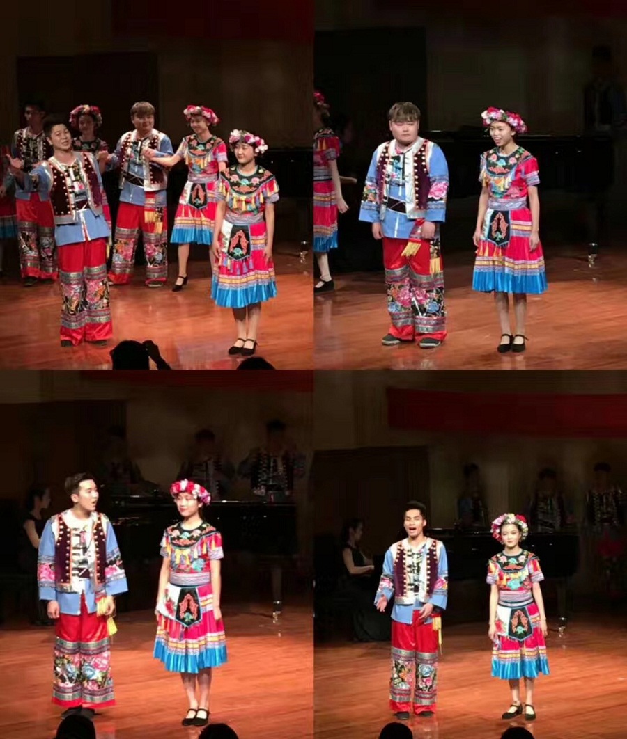 音乐会在一首轻快活泼的女生合唱《闲聊波尔卡》中拉开了序幕,同学们接连表演了《十送红军》、《木叶吹啊吹》、《笑之歌》等耳熟能详的音乐作品。优美的旋律、抒情的歌声,让大家陶醉在音乐的海洋中。而《六口茶》、《直尕思得》、《黑眉毛的姑娘》等作品的演绎充分体现出了同学们对中国各民族民歌的热爱。《美丽的康定溜溜的城》、《瑶山青》、《想你哩》、《玛依拉变奏曲》等对唱及独唱作品也向观众们展现出了刘佳蓉老师优秀的教学成果。同学们声情并茂地演绎了一首首中外名曲,现场洋溢着强烈的艺术氛围。最后,音乐会在全体男生一曲精心编排的《民歌联唱》中落下了帷幕。