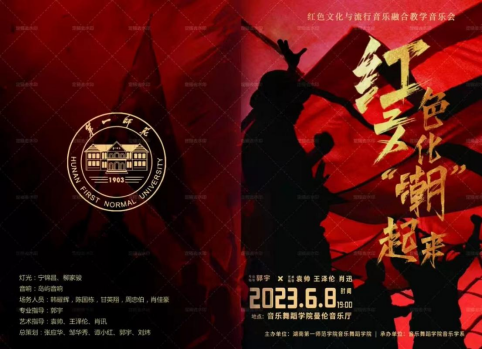 2023年6月8日晚上19:00,我院2021级音乐学专业流行音乐方向全体学生共同完成的《红色文化“潮”起来》教学音乐会圆满落下帷幕。音乐舞蹈学院邹华秀书记、张应华院长、谭小红副书记、刘炜副院长出席了本次音乐会。