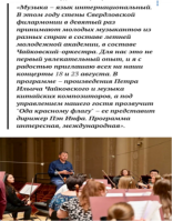 乌拉尔青年交响乐团、柴可夫斯基国际青年交响乐团首席指挥Dmitry Filatov说道:“音乐是一种国际语言。今年,叶卡捷琳堡爱乐乐团第九次接待来自不同国家的年轻音乐家,他们将成为柴可夫斯基青年交响乐团的一部分。这不是我们第一次激动人心的经历,我很高兴邀请大家参加我们8月18日和23日的音乐会。 节目包括彼得·伊里奇·柴可夫斯基的作品和中国作曲家的音乐,《红旗颂》将在特邀中国青年指挥彭英发的指挥下完成,这个节目很有趣,很国际化。”