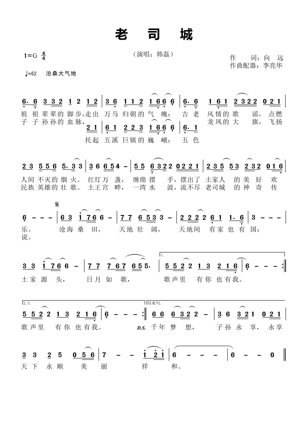 作曲作品:《老司城》李亮华曲、向远词、韩磊唱