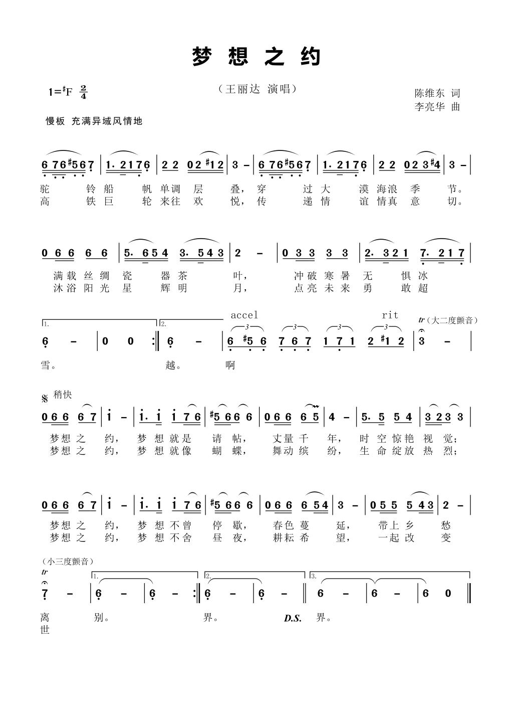 作曲作品:《梦想之约》李亮华曲、陈维东词、王丽达唱