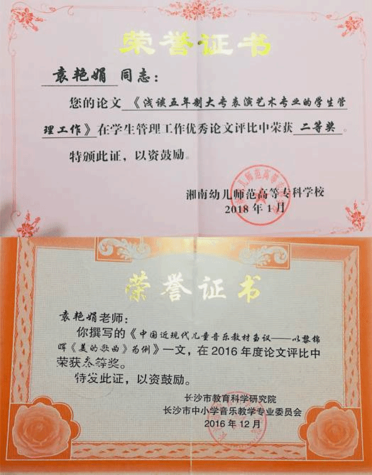 2018年1月,论文《浅谈五年制大专表演艺术专业的学生管理工作》在湘南幼儿师范高等专科学校学生管理工作优秀论文评比中荣获二等奖。